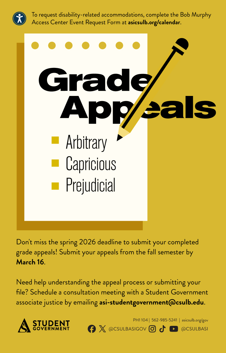 Don’t miss the spring 2026 deadline to submit your completed grade appeals! Submit your appeals from the fall or winter semesters by March 16. Need help understanding the appeal process or submitting your file? Schedule a consultation meeting with a Student Government associate justice by emailing asi-studentgovernment@csulb.edu.