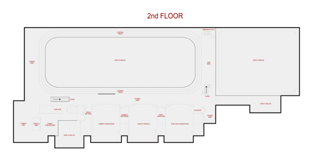 The second floor of the SRWC is primarily dedicated to cardio equipment and an indoor jogging track, featuring numerous treadmills, bikes, ellipticals, and rowing machines. While one side houses weight-lifting and abdominal exercise equipment, the other side contains specialized spaces including Beach Balance, the Farber Fitness Room, Fitness Room B, and the Pura Vida Fitness Room, where most fitness classes and workshops take place.