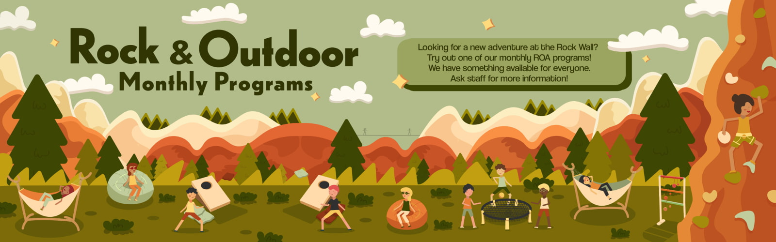 The Rock & Outdoor Adventures program offers outdoor equipment rentals and a variety of activities, including belay classes, bouldering, top-rope climbing, slacklining, hiking, outdoor rock climbing and more.